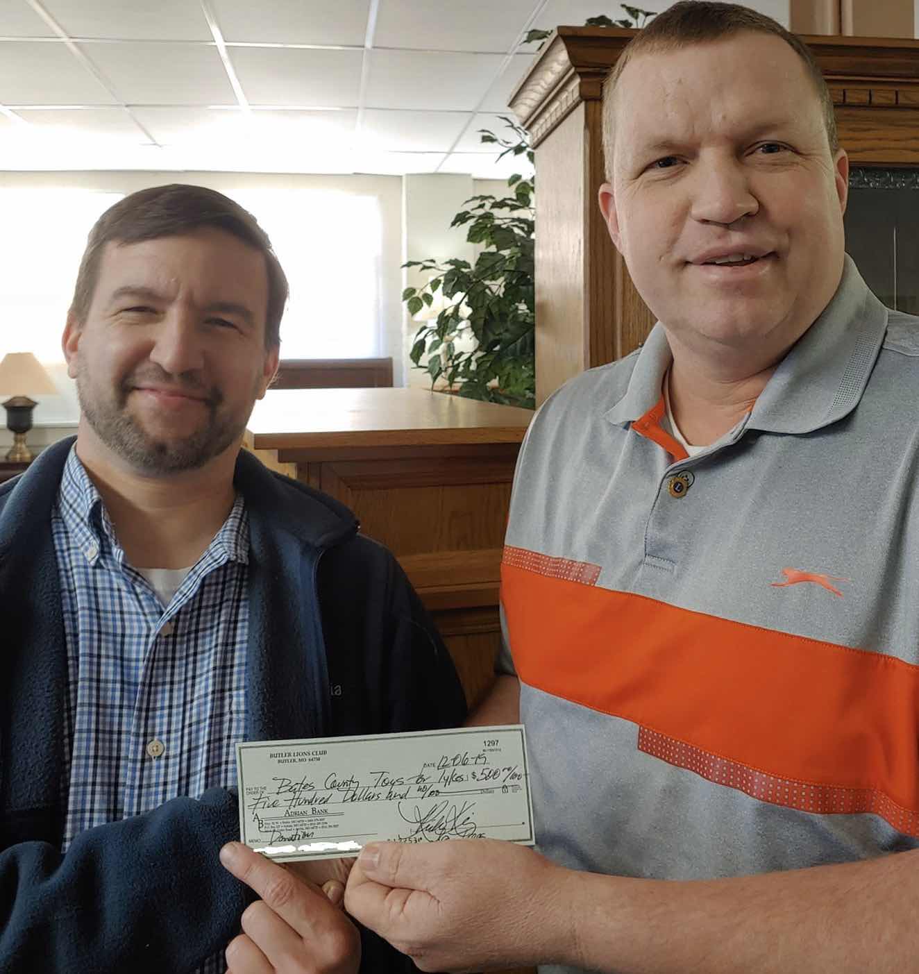 Today the Butler Lions Club made a donation to the local Toys for Tykes program through The Butler Masonic Lodge. Pictured with Lions Club President Shawn McVey is Masonic Lodge President Rob Dixon.