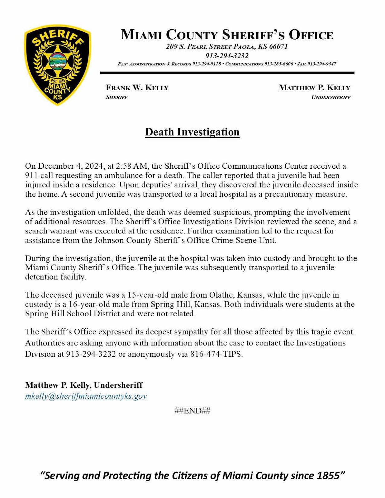 Juvenile Death Investigation Update in Miami County Kansas